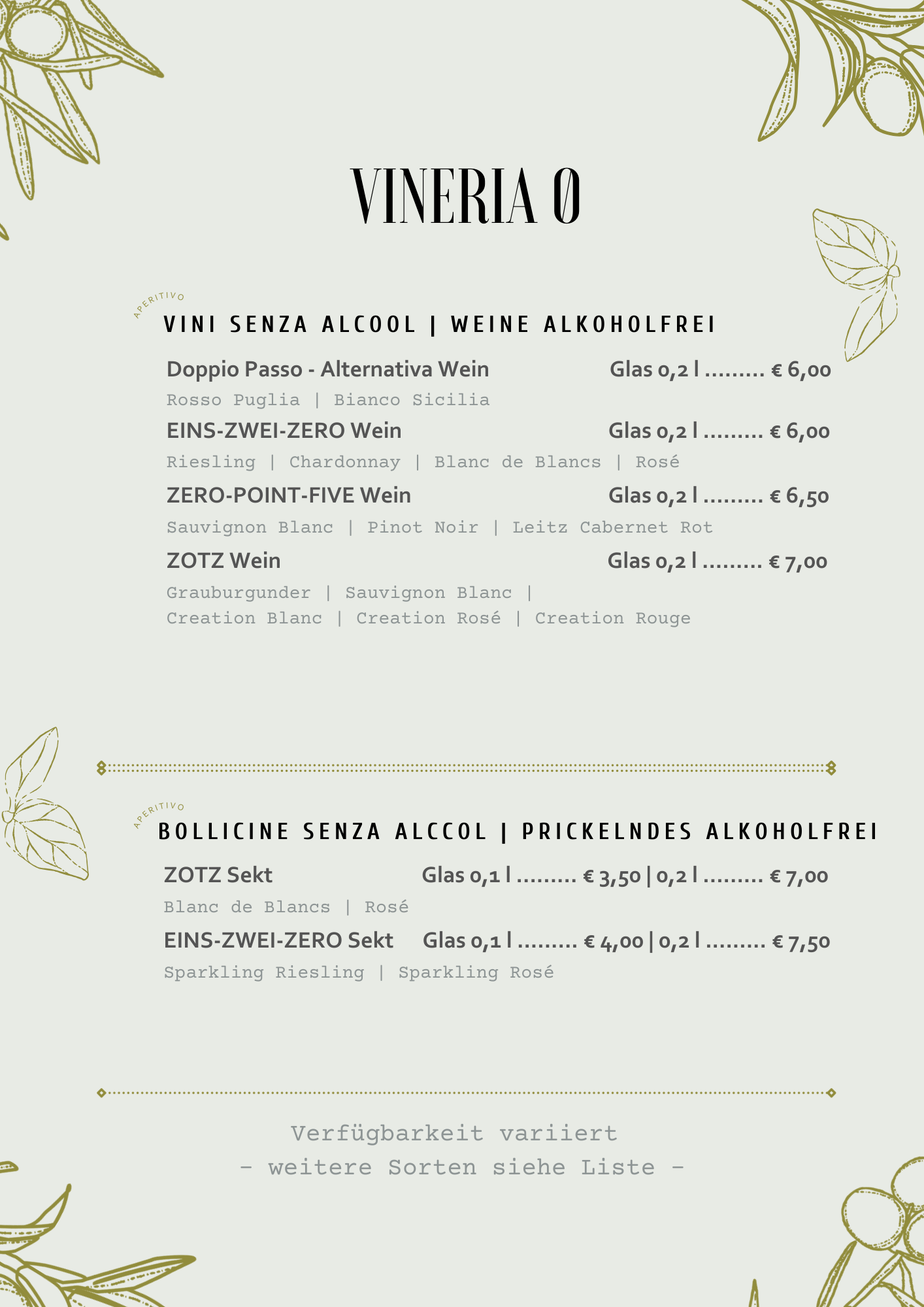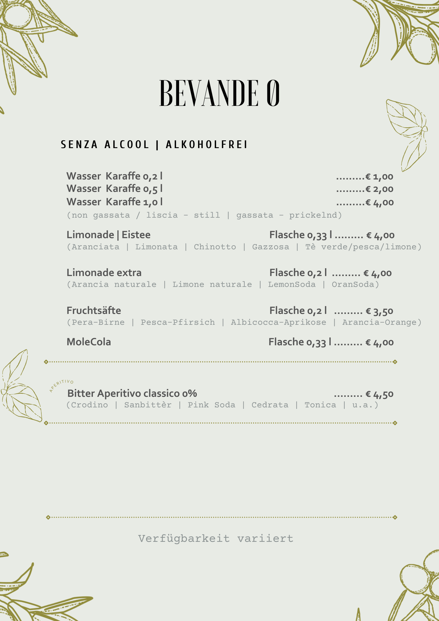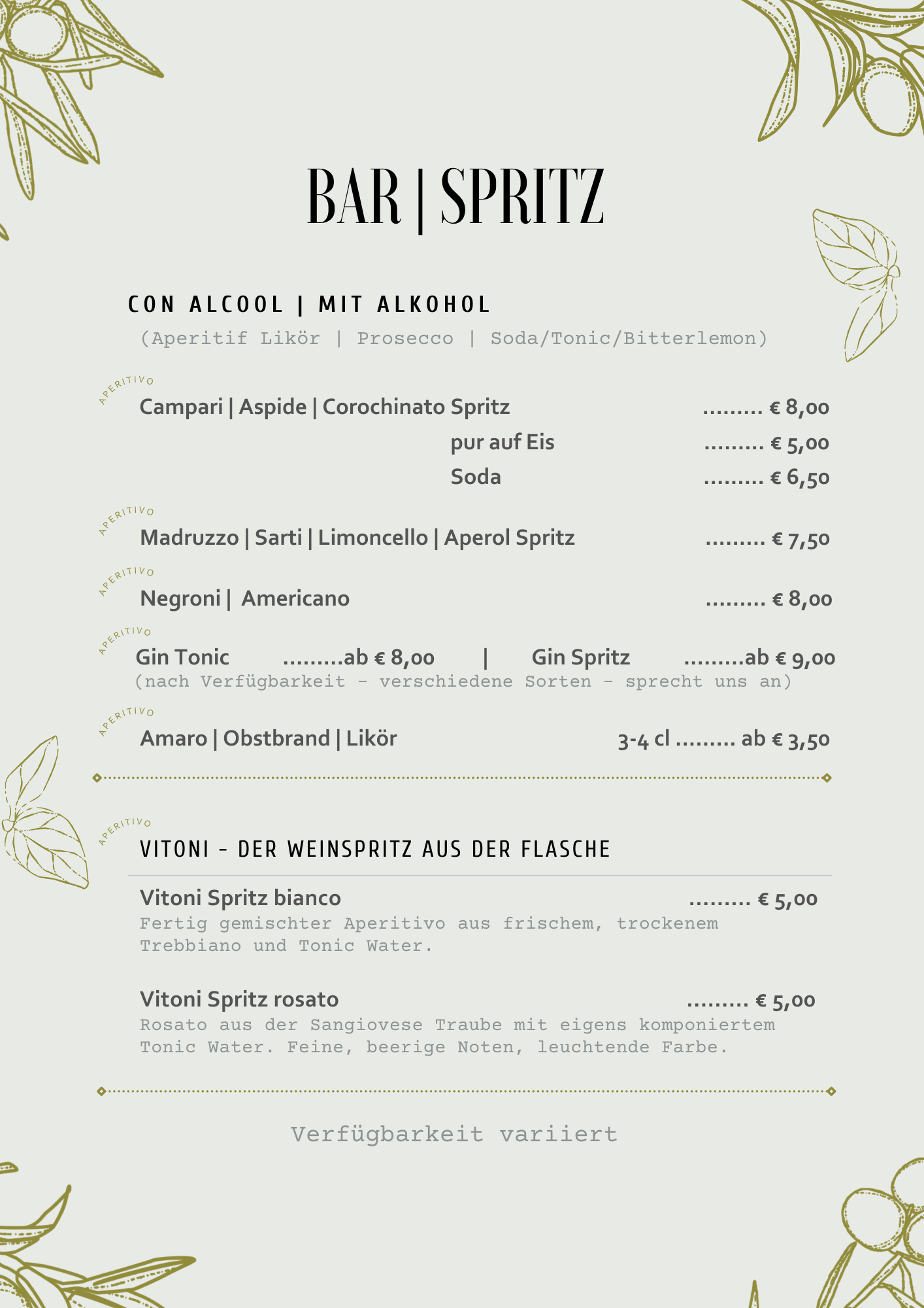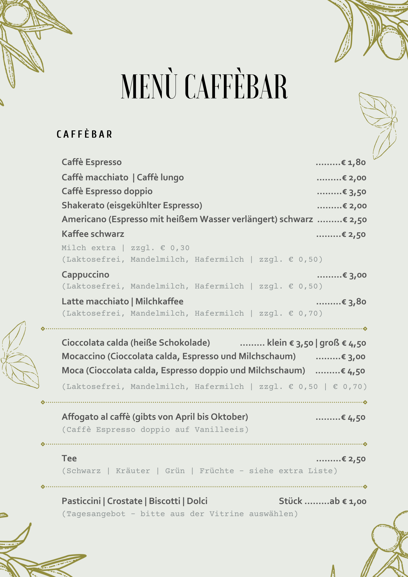 Um den Abend perfekt abzurunden, starten wir mit einem Aperitivo mit einem kleinen Buffet als Vorspeise und natürlich etwas Süßes vom Chef Pasticcere Giovanni zum Abschluß.