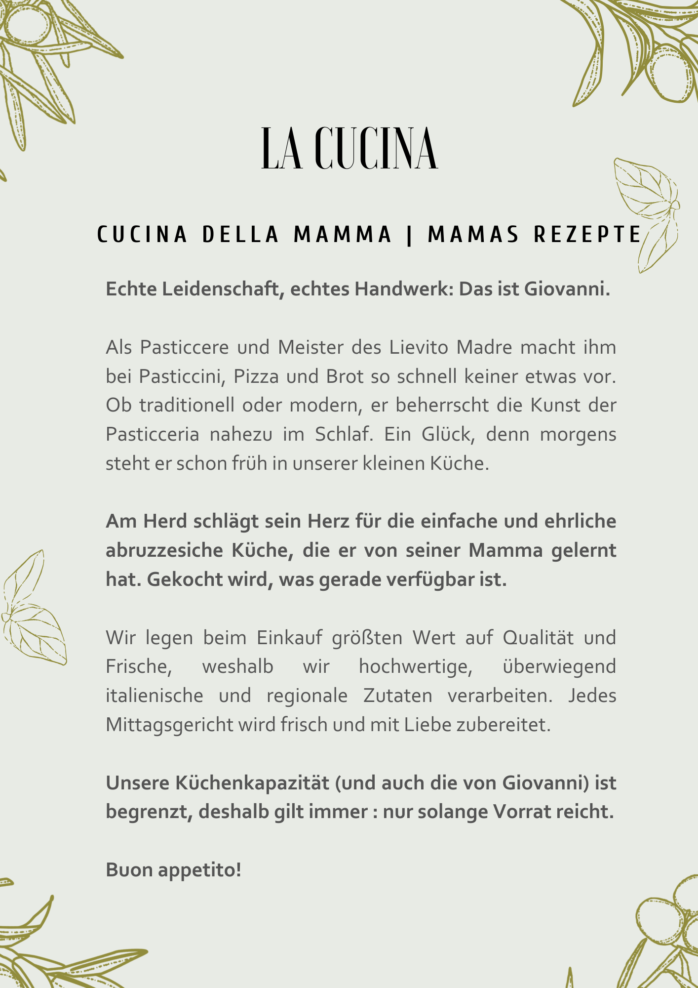 unser Herz schlägt für die Abruzzen, wo das rauhe Gebirge das Meer umarmt und jeder Bissen eine Geschichte erzählt. Wir laden euch herzlich zu einem Abend ein, der die vielfältige Schönheit dieser Region feiert. Lasst uns gemeinsam die Seele der Abruzzen spüren und erfahrt noch mehr über das ‘echte’ Italien.