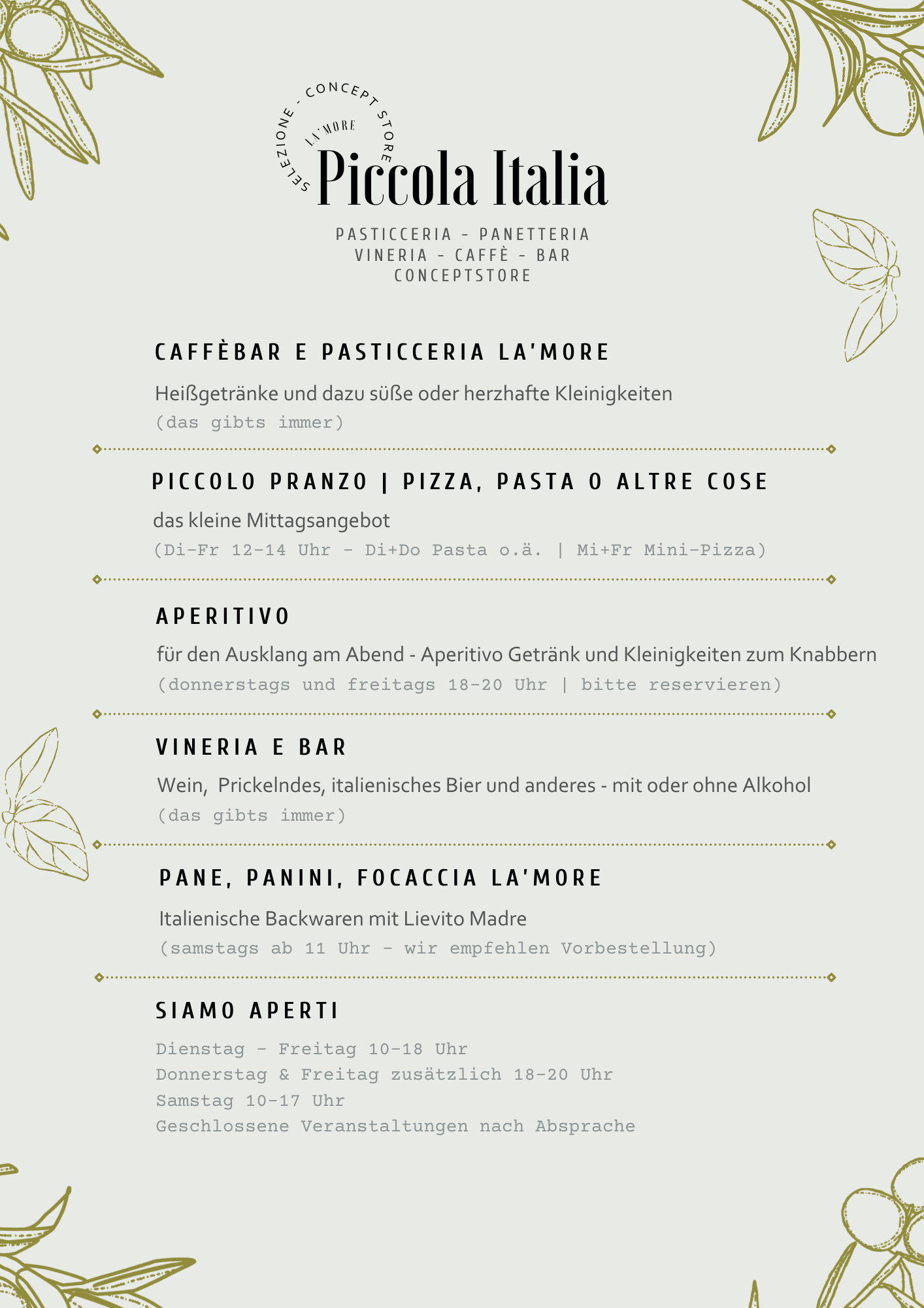 Hier geht es zu den Piccola Italia Paketen. Bei Fragen schickt uns eine Mail, kommt im Laden vorbei oder schickt uns eine Whatsapp an 0171-8127190.